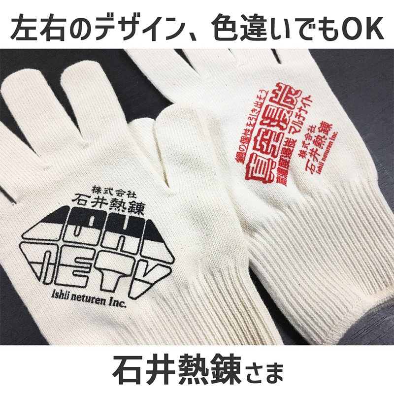 石井熱錬さまよりノベリティ用の名入れ軍手のご注文を頂き、デザインの作成からさせて頂きました。 使用した手袋の種類は【 017 綿のびのび手袋 生成 】です。