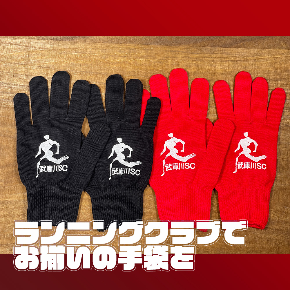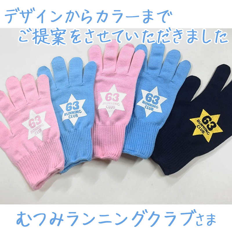 むつみランニングクラブさまよりチームのオリジナル手袋を作りたいとのことで、デザインの作成からさせて頂きました。 使用した手袋の種類は【 13G綿カラー軍手 ピンク ブルー 】です。