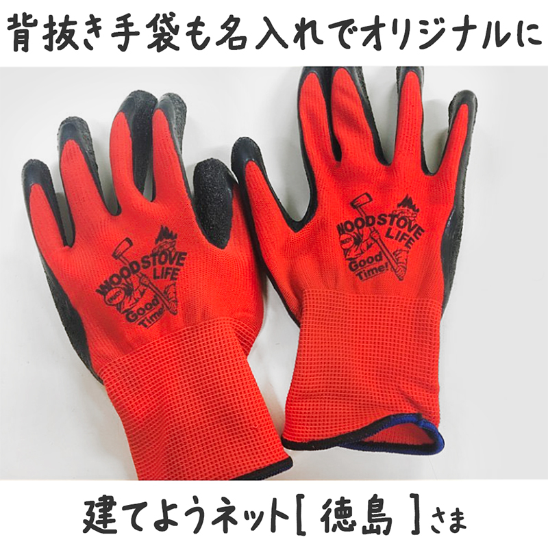 建てようネット[ 徳島 ]さまより薪ストーブイベントでご使用とのことでご注文頂きました。 「握る」「掴む」などの力を込める作業が多い場合、グリップ力の強い背抜き手袋が最適です。 使用した手袋の種類は【 天然ゴム背抜き手袋 】です。
